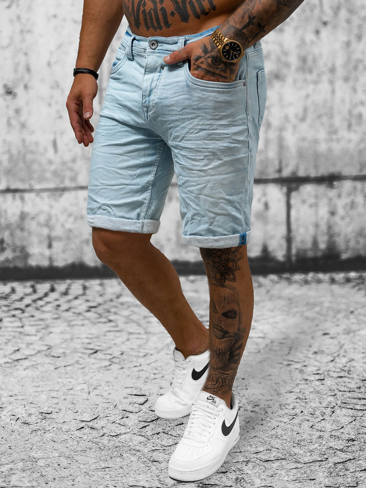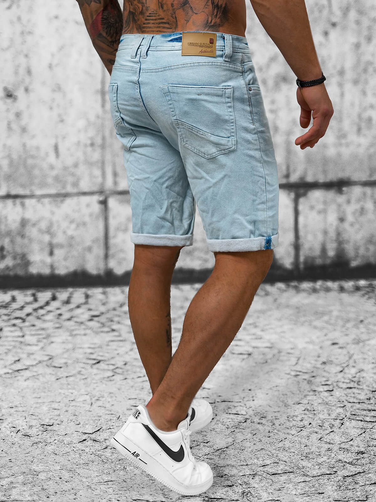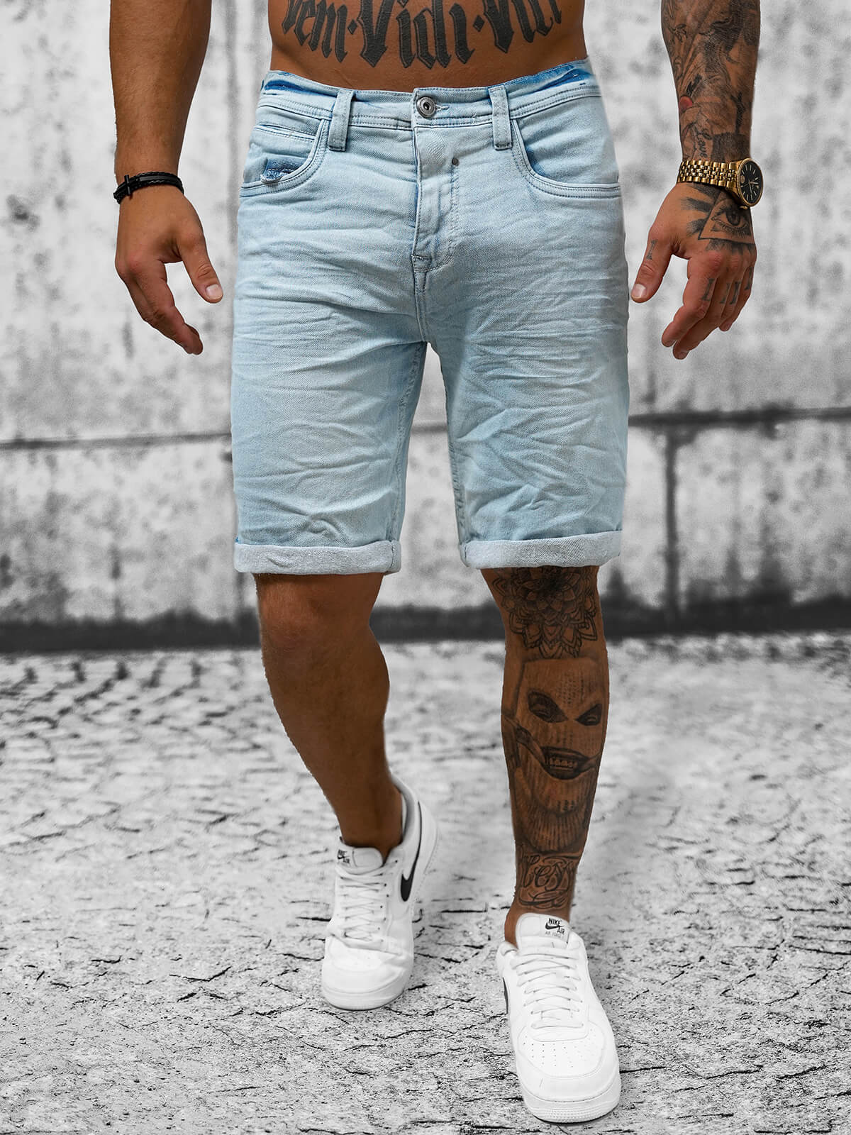Vă prezentăm pantalonii scurți de blugi pentru bărbați, de culoare albastru deschis, de la Ozonee O/19200, parte a celei mai noi colecții. Aceștia au fost confecționați cu un stil distinct, prezintă uzuri subtile și cute, care le oferă un caracter unic. Buzunarele practice amplasate în față și în spate oferă un spațiu util pentru păstrarea articolelor mici.