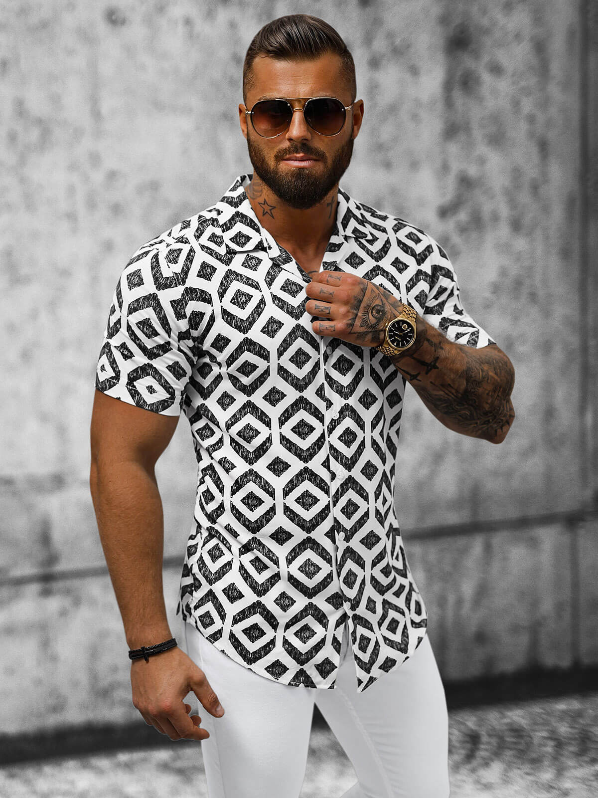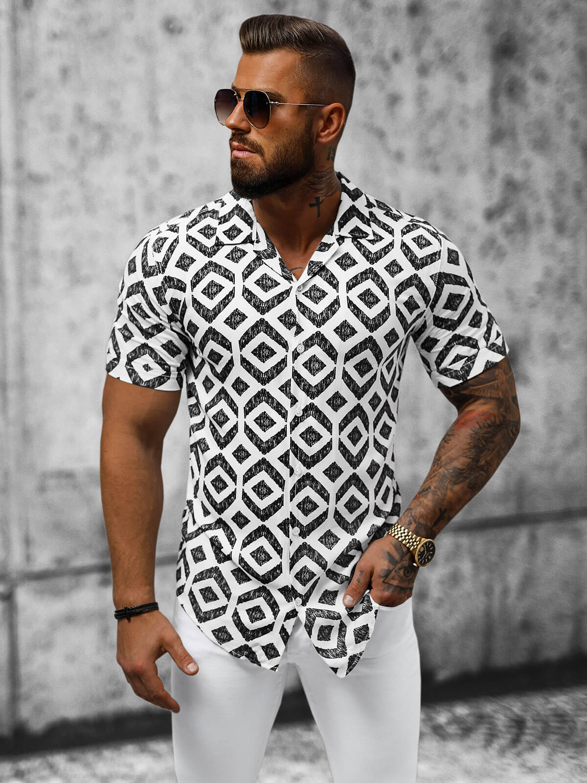 Caracteristicile cămășii pentru bărbați: Închidere clasică cu nasturi, Mâneci scurte, Guler cubanez, Model original în losange