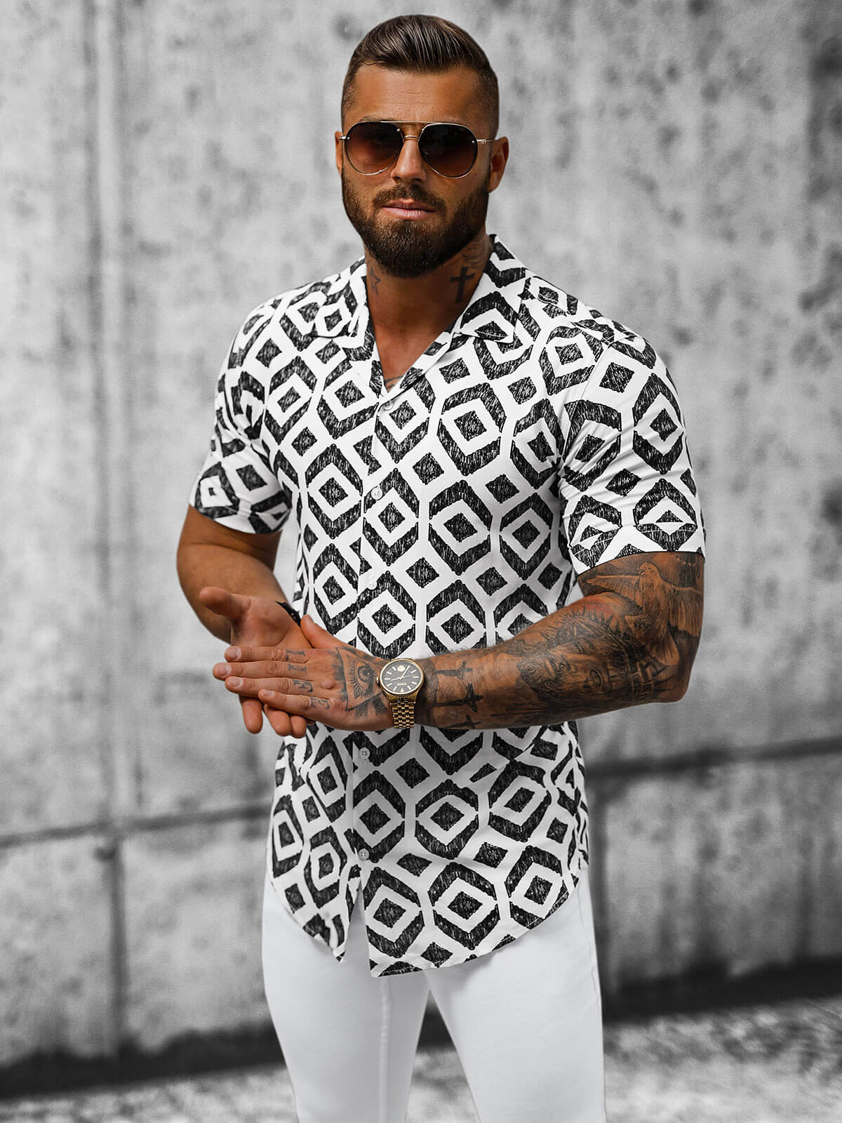 Gulerul cubanez caracteristic acestei cămăși îi conferă un caracter unic și este în deplină concordanță cu cele mai recente tendințe în modă. Modelul distinct în losange face ca această cămașă să fie unică și subliniază personalitatea celui care o poartă.