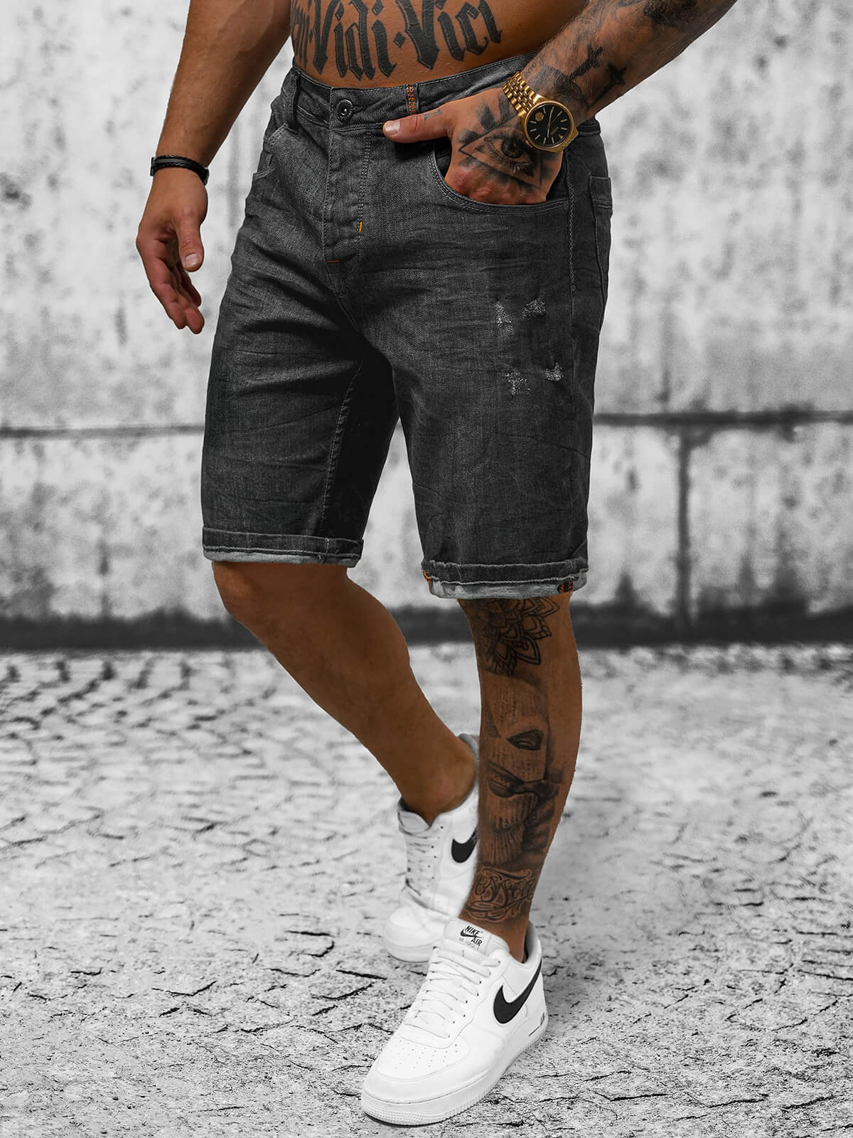 Vă prezentăm pantalonii scurți de blugi negri pentru bărbați Ozonee O/24000 din cea mai recentă colecție, care impresionează prin stilul lor atemporal și calitatea înaltă a lucrării. Detaliile ușor deteriorate le oferă un caracter urban distinct, iar buzunarele situate în față și în spate subliniază funcționalitatea lor. Acești pantaloni scurți au fost concepuți pentru bărbații moderni care apreciază confortul, practicitatea și aspectul la modă.