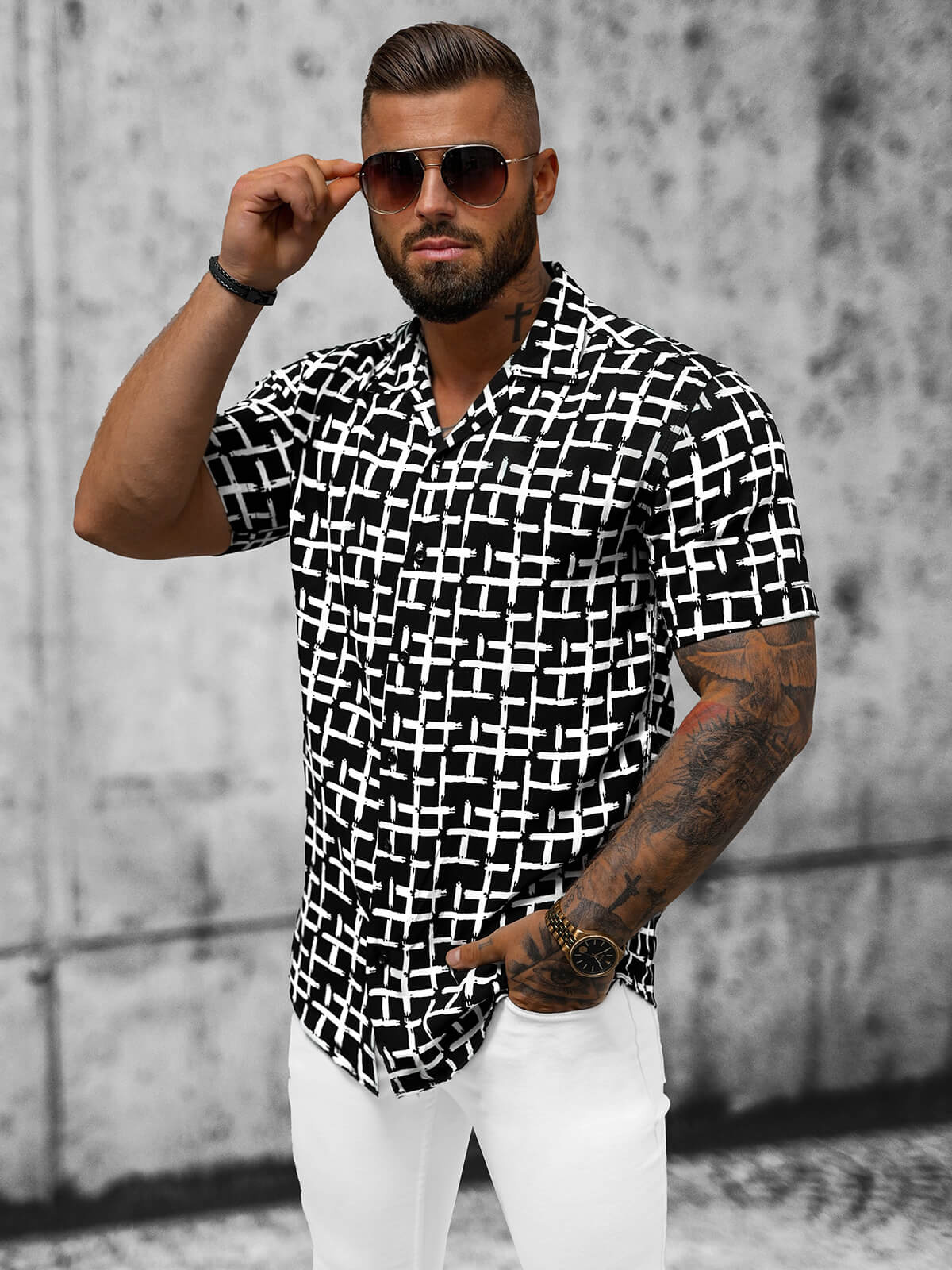 Descoperă stilul rafinat cu cămașa noastră bărbătească alb-negru Ozonee E/1400/28Z din cea mai recentă colecție. Această cămașă cu mânecă scurtă, realizată dintr-un material respirabil, nu oferă doar o imagine excepțională, ci și un confort de purtat pe tot parcursul zilei. Detaliul care diferențiază acest model este gulerul cubanez modern și modelul designer-ului cu linii intersectate în alb, care adaugă un caracter unic acestei cămăși.