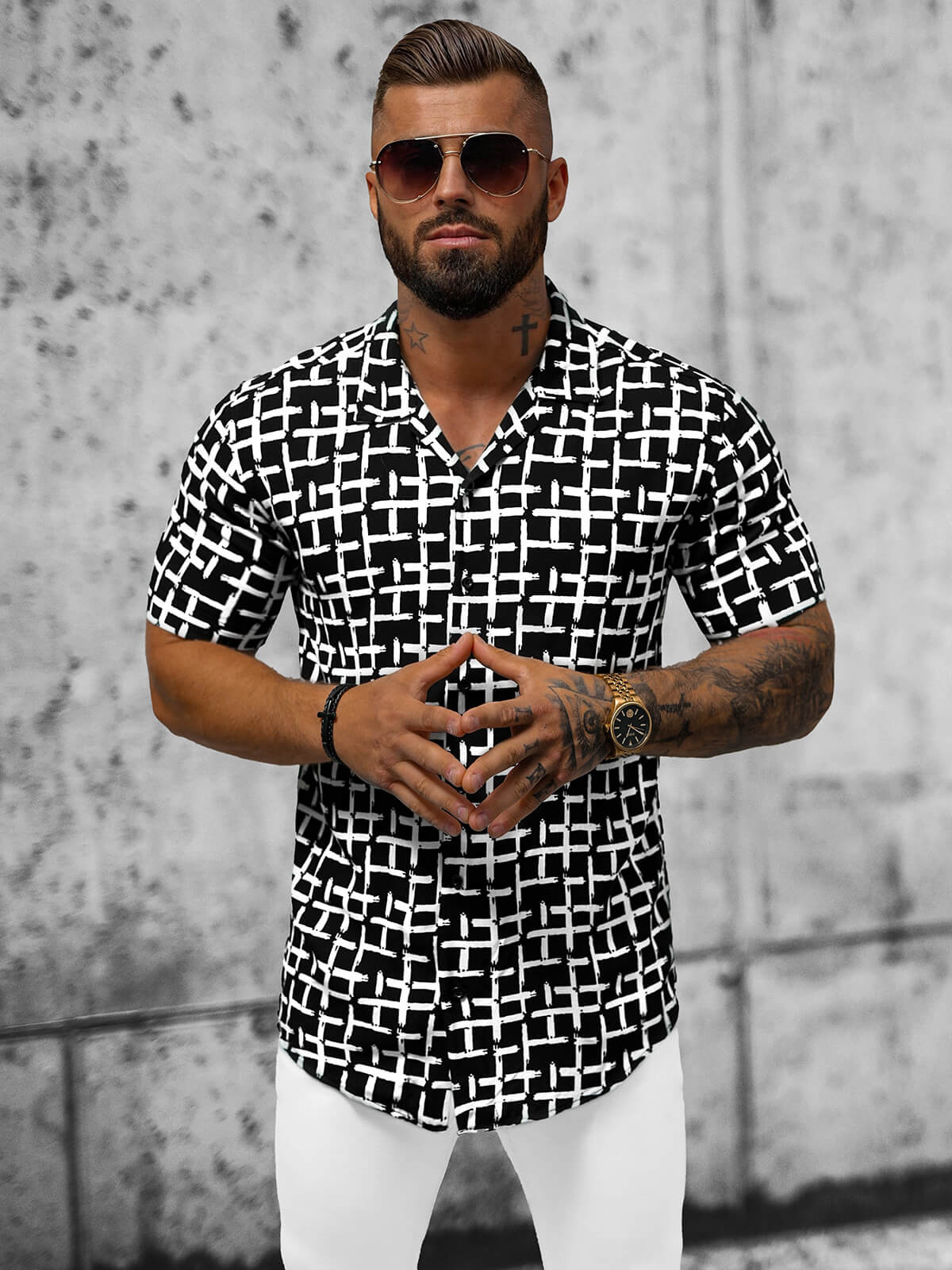 Cămașa este închisă cu nasturi, adăugându-i un aspect clasic și funcționalitate. Proiectată cu gândul la bărbatul modern, cămașa este durabilă și ușor de întreținut datorită utilizării a 100% bumbac ca material principal. Aceasta o face o alegere excelentă pentru uzul zilnic, dar și pentru ocazii speciale. Această cămașă alb-negru cu mânecă scurtă de la Ozonee este o combinație perfectă de confort, stil și funcționalitate, care te va scoate în evidență în mulțime și îți va accentua stilul individual.