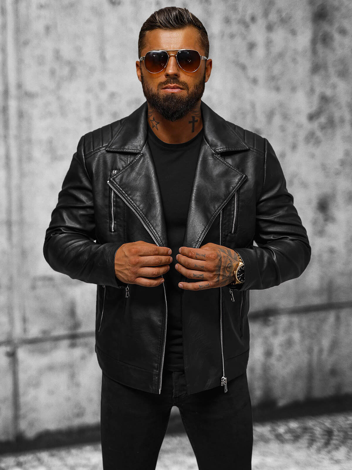 Geacă de piele bărbați neagră OZONEE JS/11Z8067