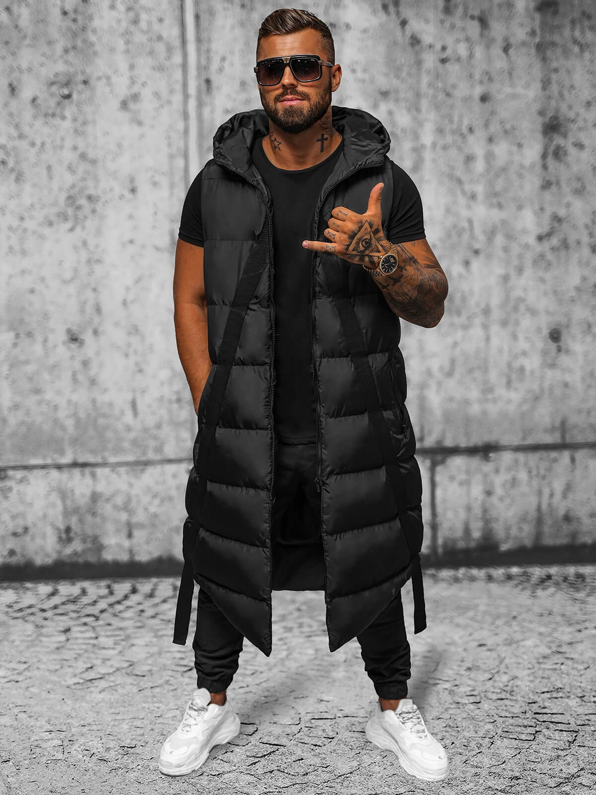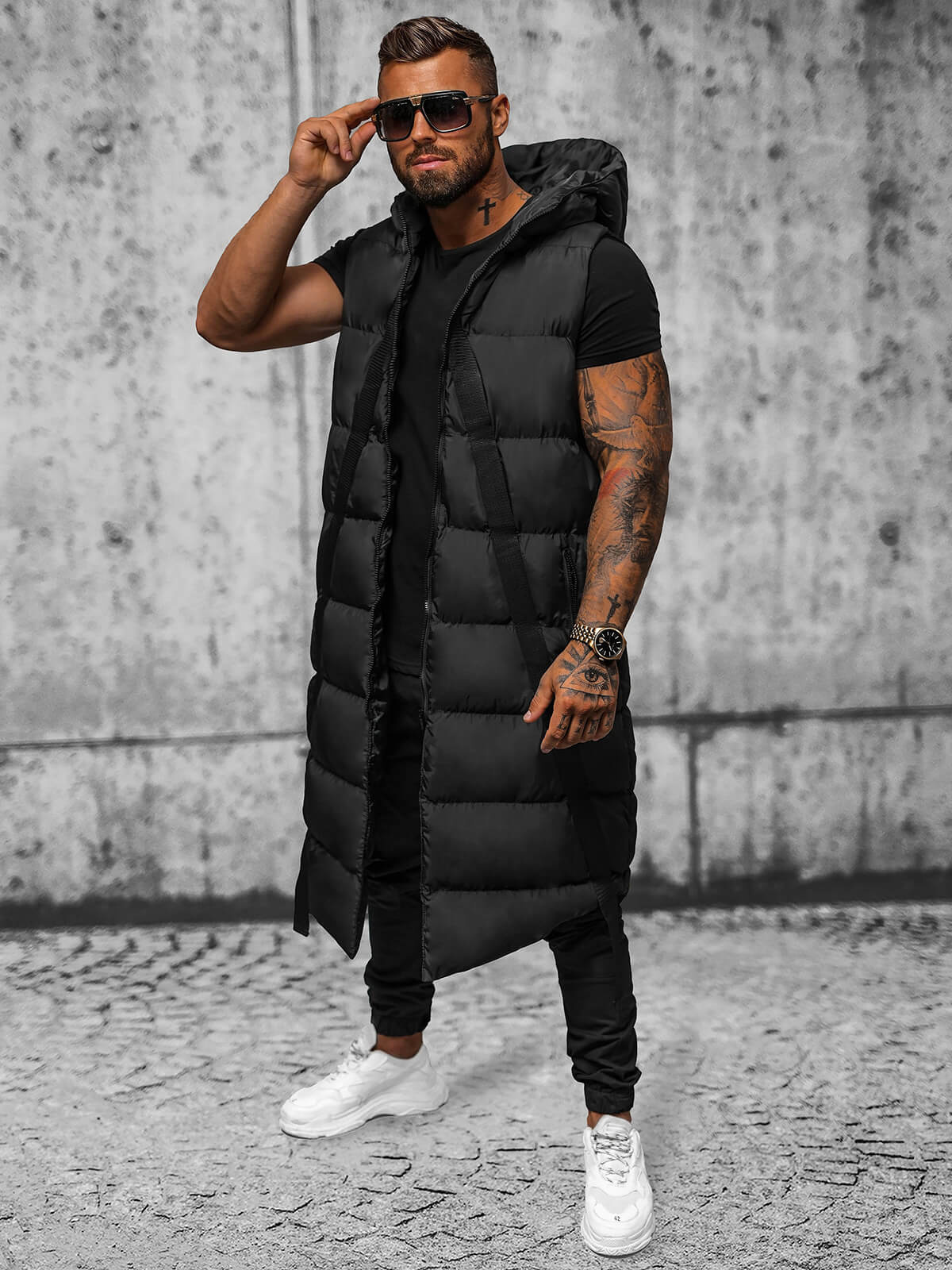 Vesta lungă matlasată pentru bărbați cu glugă neagră OZONEE O/M3201