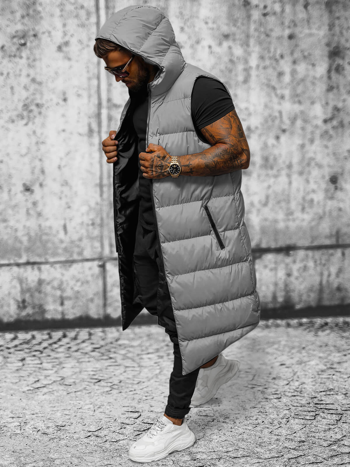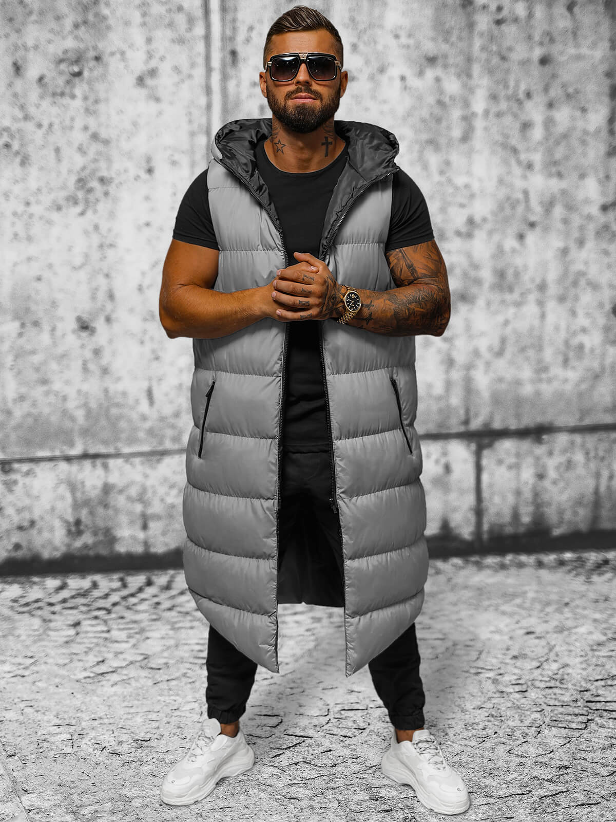 Vesta lungă matlasată pentru bărbați cu glugă gri OZONEE O/M3203Z