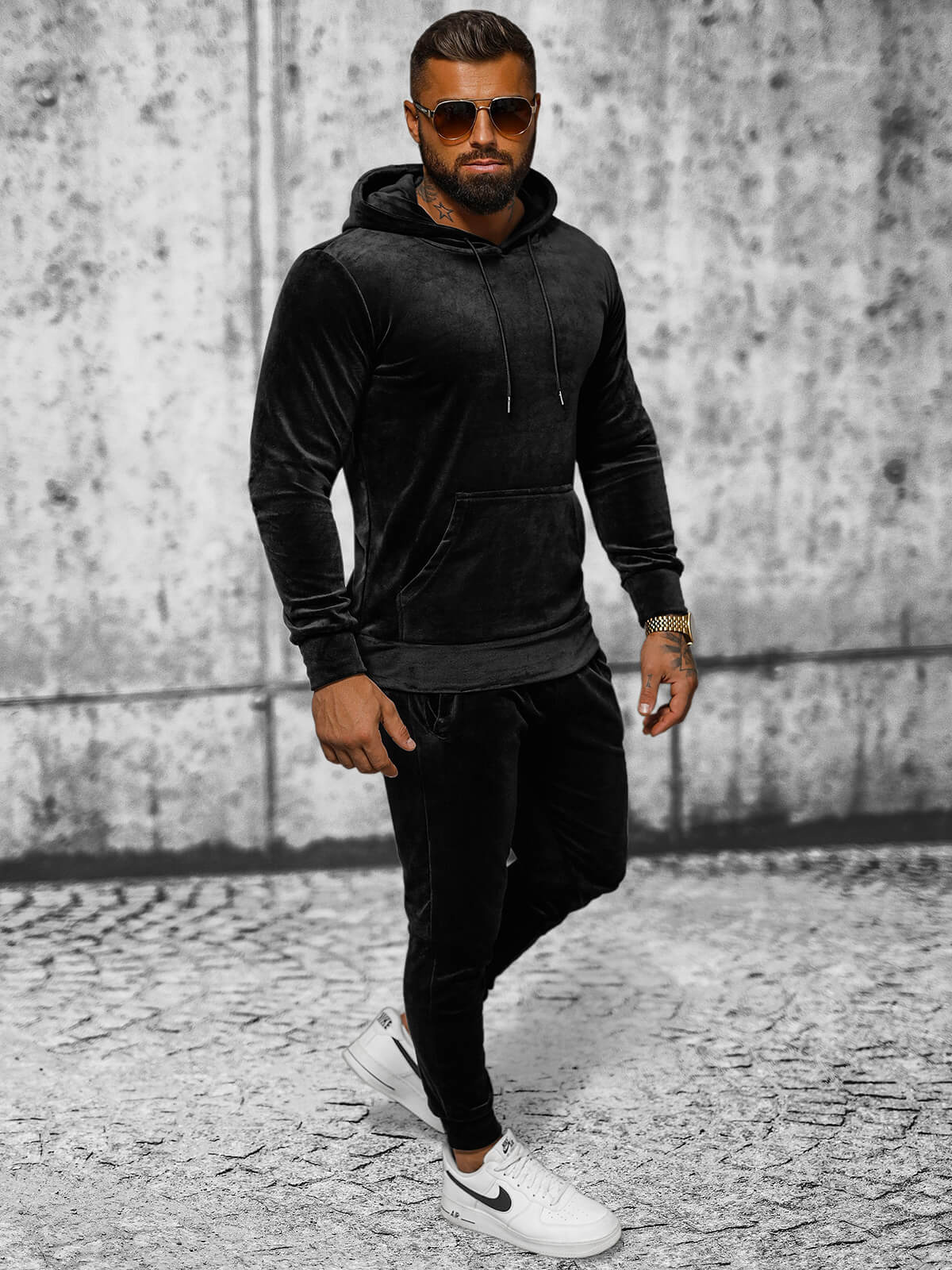 Setul de trening din velur pentru bărbați negru OZONEE JS/8C1171/3 este alegerea perfectă pentru diverse ocazii. Va funcționa bine atât în timpul activității fizice, cât și pentru uzura de zi cu zi. Poate fi combinat cu diverse articole de îmbrăcăminte pentru a crea seturi elegante și confortabile. Treningul se potrivește bine cu adidașii la modă, dar și cu pantofii sport clasici. Este o alegere versatilă pentru orice bărbat care apreciază confortul și un look la modă.