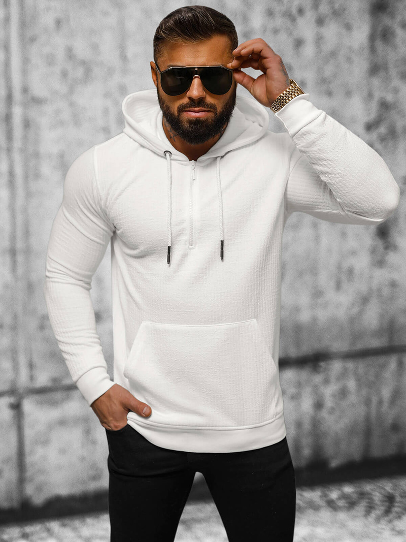 Hanoracul cu glugă ecru pentru bărbați OZONEE O/TB2273 este o propunere pentru bărbații care apreciază confortul și un look la modă. Confecționat din materialów de cea mai bună calitate, garantează confortul purtării pe tot parcursul zilei. Descheiat parțial, cu un model convex la modă, este nu doar practic, ci și elegant. Tivul și mânecile cu nervuri asigură o potrivire perfectă.
