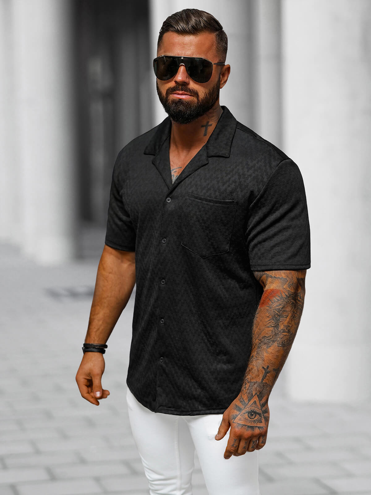 Cămașa bărbătească cu mânecă scurtă prezentată, de culoare neagră, de la OZONEE, este o combinație între clasici și cele mai noi tendințe. Confecționată din materialów de cea mai bună calitate, garantează un confort de purtare pe tot parcursul zilei. Prezintă un model în relief la modă și un guler cubanez care adaugă o notă unică. Încheiat cu nasturi, este prevăzut și cu un buzunar practic în față, subliniind funcționalitatea sa.