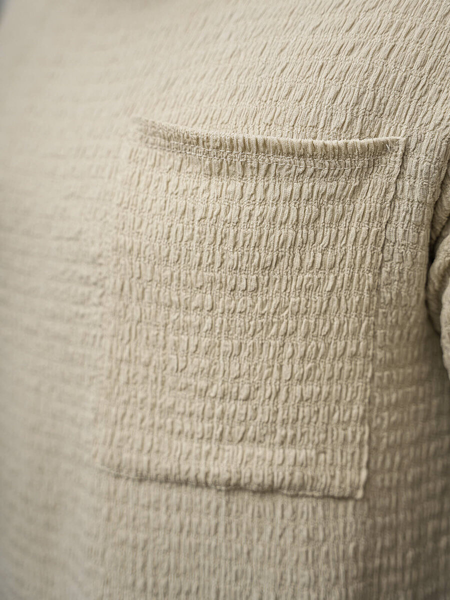 Accentuează-ți eleganța masculină cu noua colecție de tricouri de bază pentru bărbați de la OZONEE. Confecționat din tricotaje de cea mai bună calitate, acest tricou bej nu oferă doar un confort excepțional la purtare, ci și un aspect la modă. Se remarcă printr-un model unic în relief care îi conferă o notă deosebită. În plus, tricoul este prevăzut cu un buzunar practic în față, care îi adaugă funcționalitate.