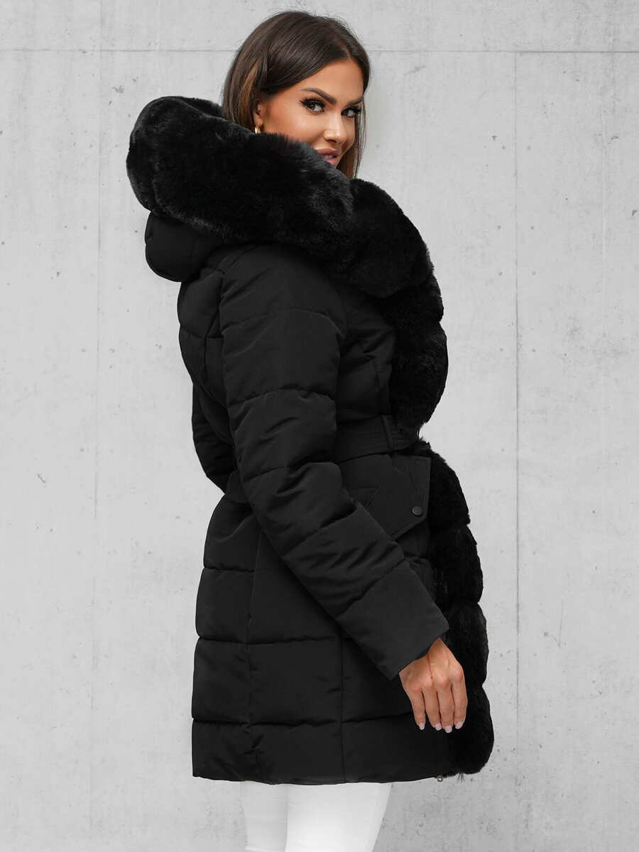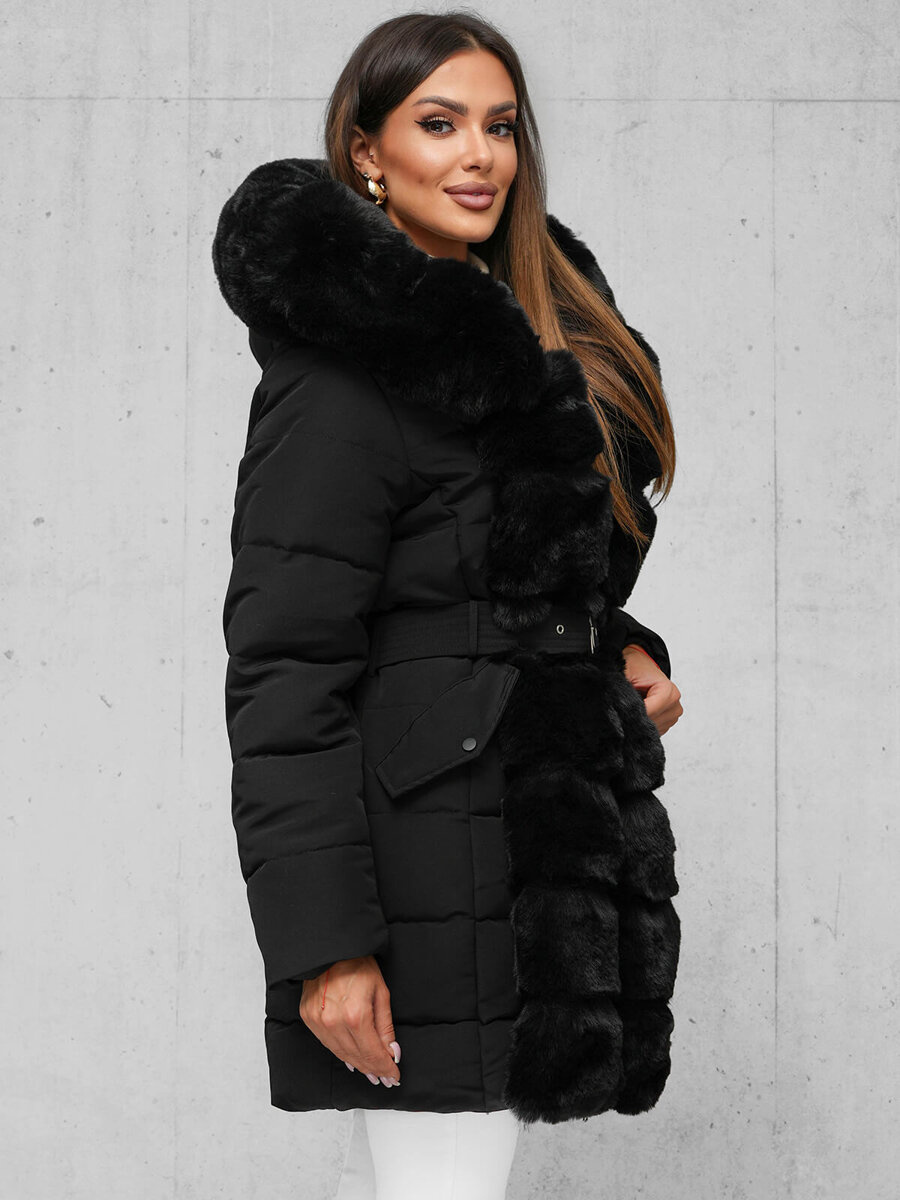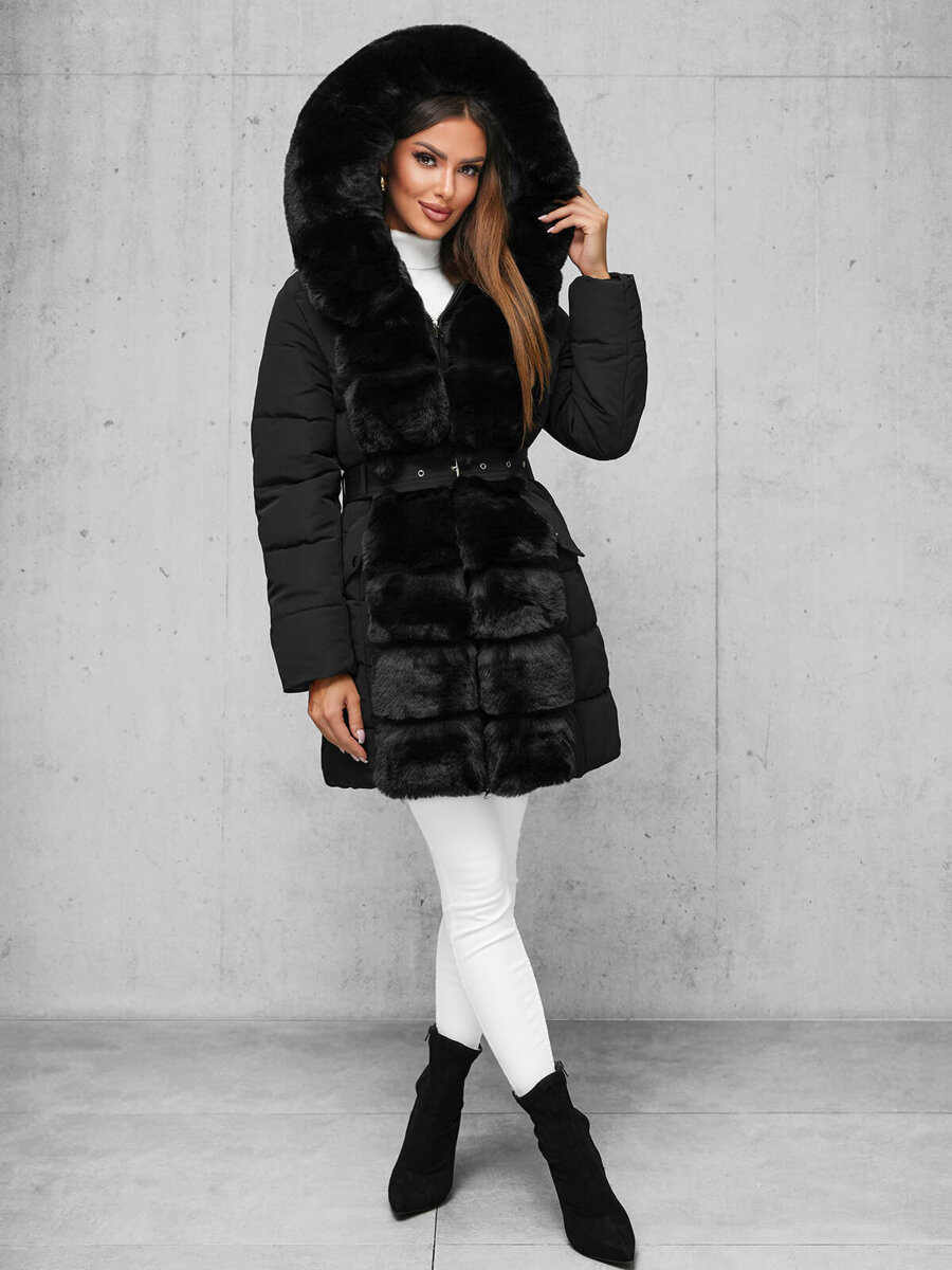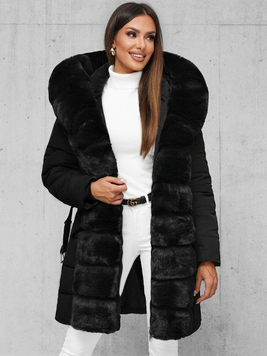 Jachetă lungă de iarnă elegantă și practică pentru femei cu blană neagră OZONEE JS/11Z8096