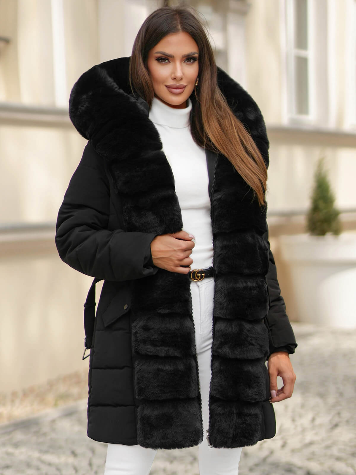 Jachetă lungă de iarnă elegantă și practică pentru femei cu blană neagră OZONEE JS/11Z8096