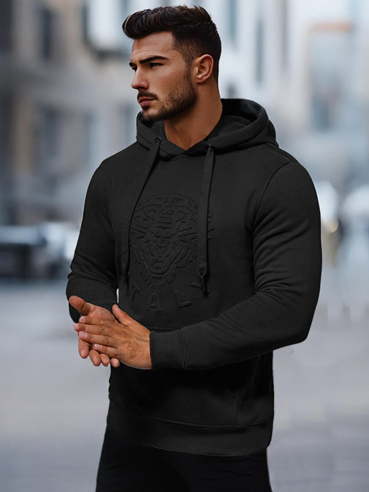 Această bluză pentru bărbați, parte a celei mai noi colecții, îmbină confortul și designul inovator. Cu un glugă practică, un buzunar tip ""kangur"", o grafică reliefată și mâneci și tiv cu țigăi elastice, această bluză te va scoate în evidență oriunde ai merge. Materialul din 39% bumbac, 60,8% poliester și 0,2% viscoză oferă o senzație plăcută la atingere și durabilitate.