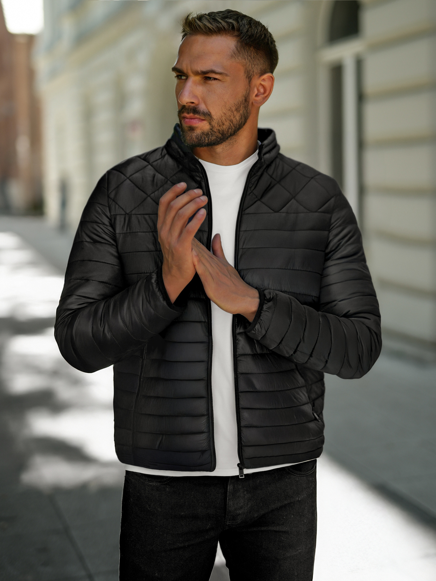 - Geaca modernă cu cusături matlasate dispune de buzunare laterale cu fermoar pentru depozitare sigură