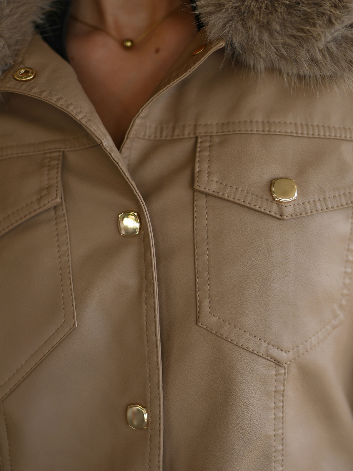 - Geaca clasică din material ce imită pielea, cu blană detașabilă la guler și mâneci, oferind versatilitate și stil
