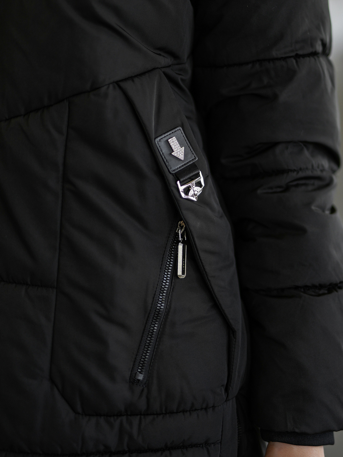 - Această geacă clasică, cu lungime sub șold, este prevăzută cu fermoar și capse, având glugă și blană detasabile pentru versatilitate