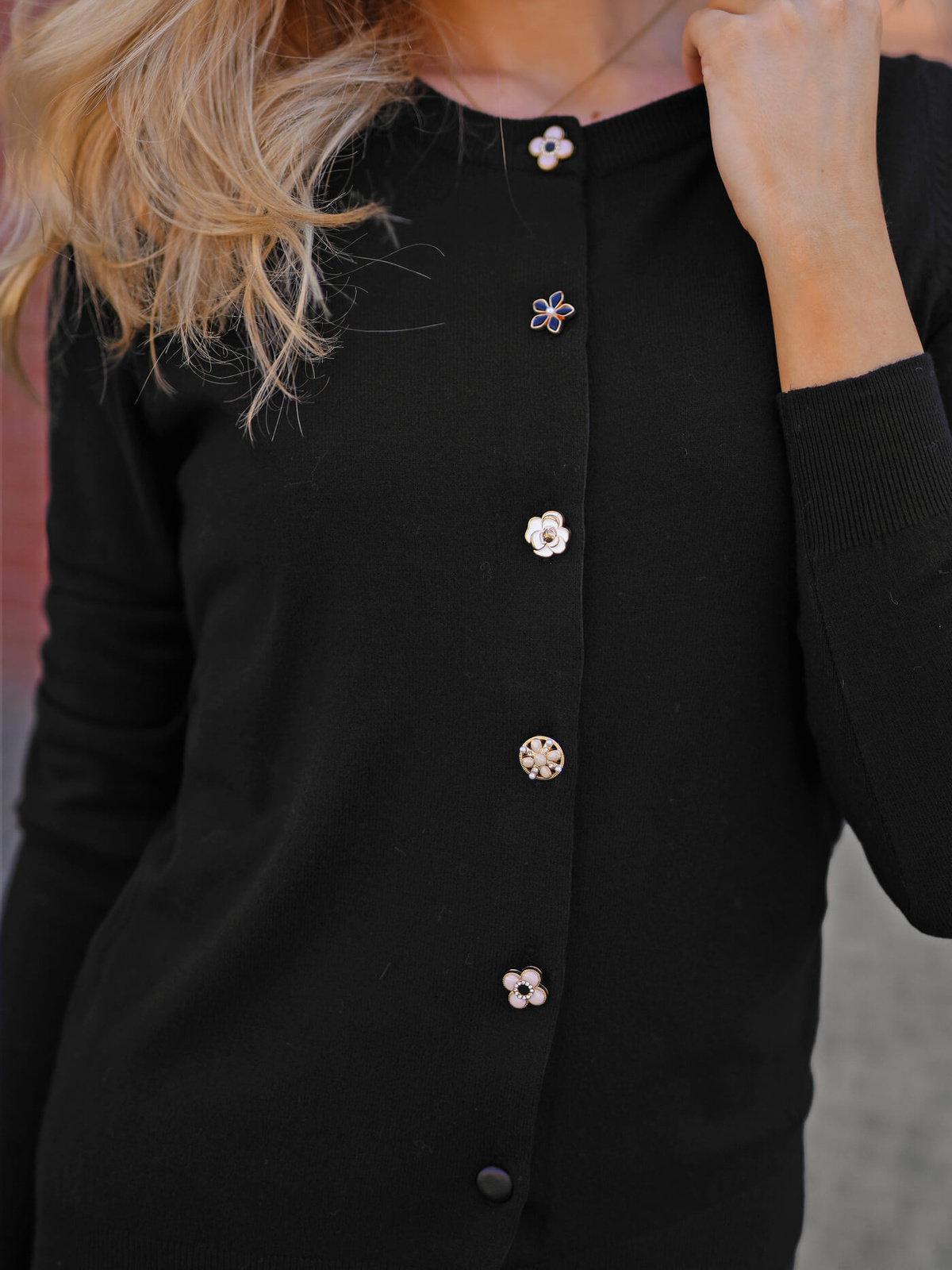 - Această clasică jachetă din tricot cu decolteu rotund și nasturi decorativi este perfectă pentru orice ținută