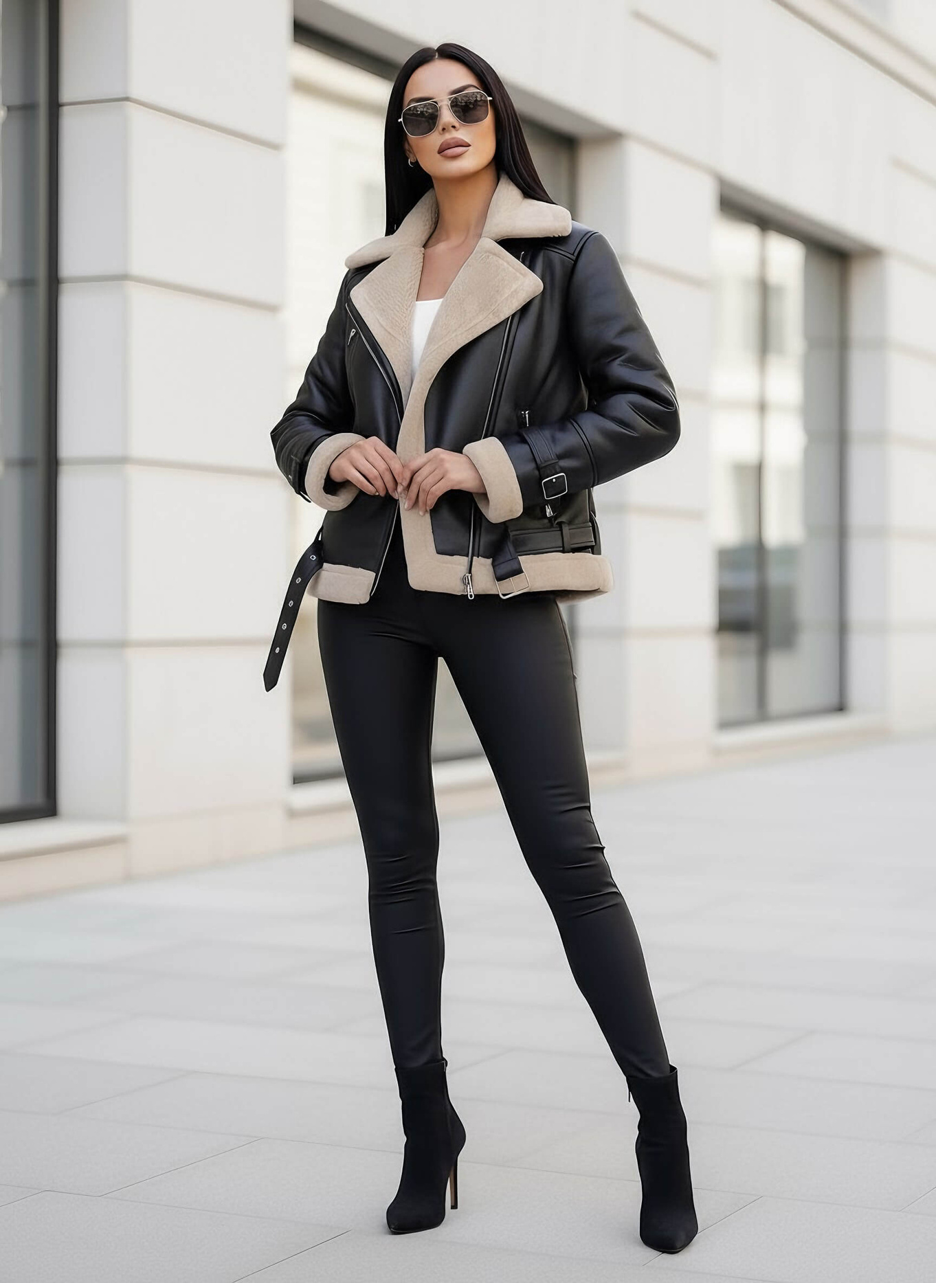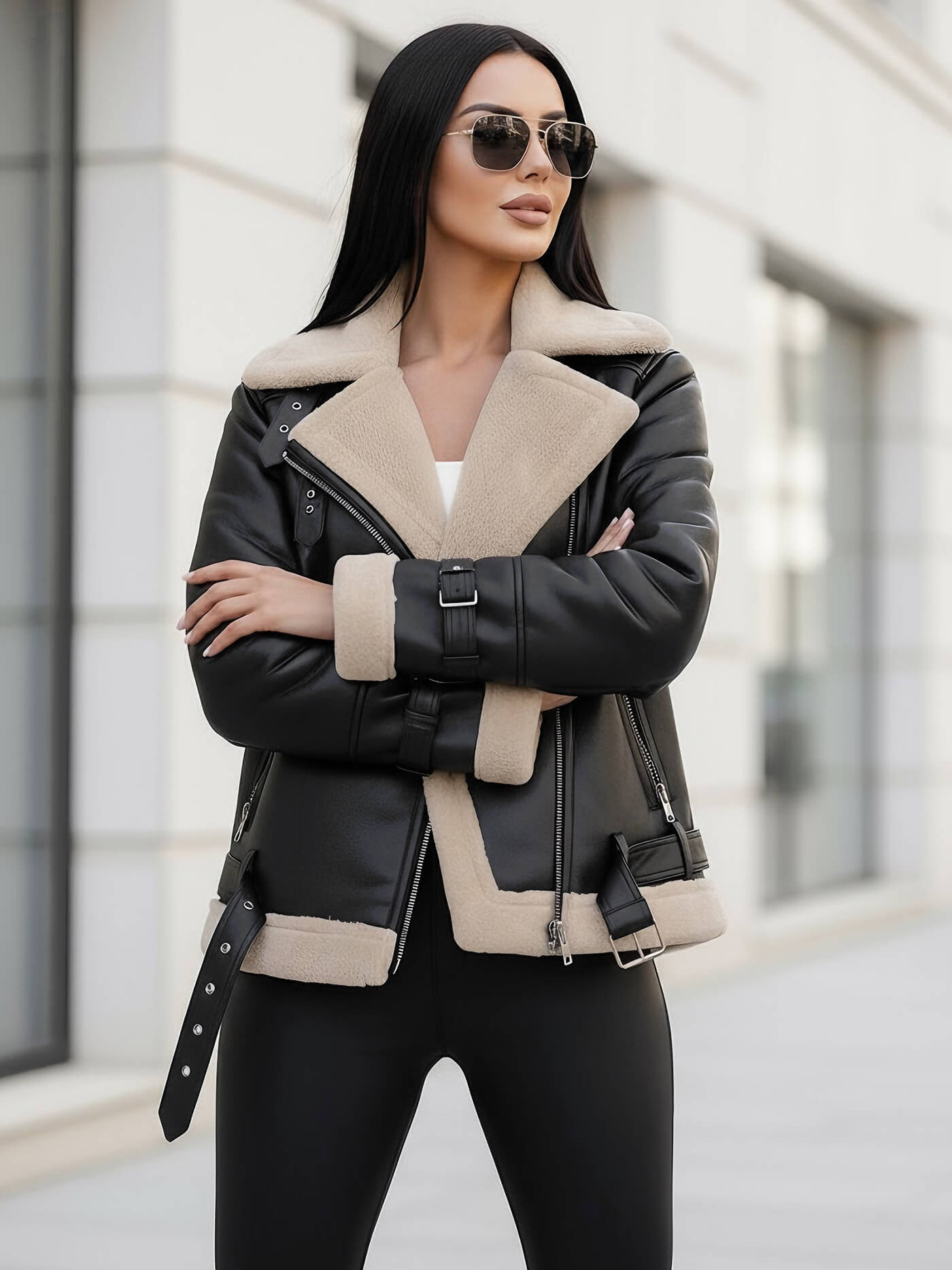 - Această geacă clasică tip ramonesc, realizată din material care imită pielea, are buzunare laterale cu fermoar pentru un aspect perfect