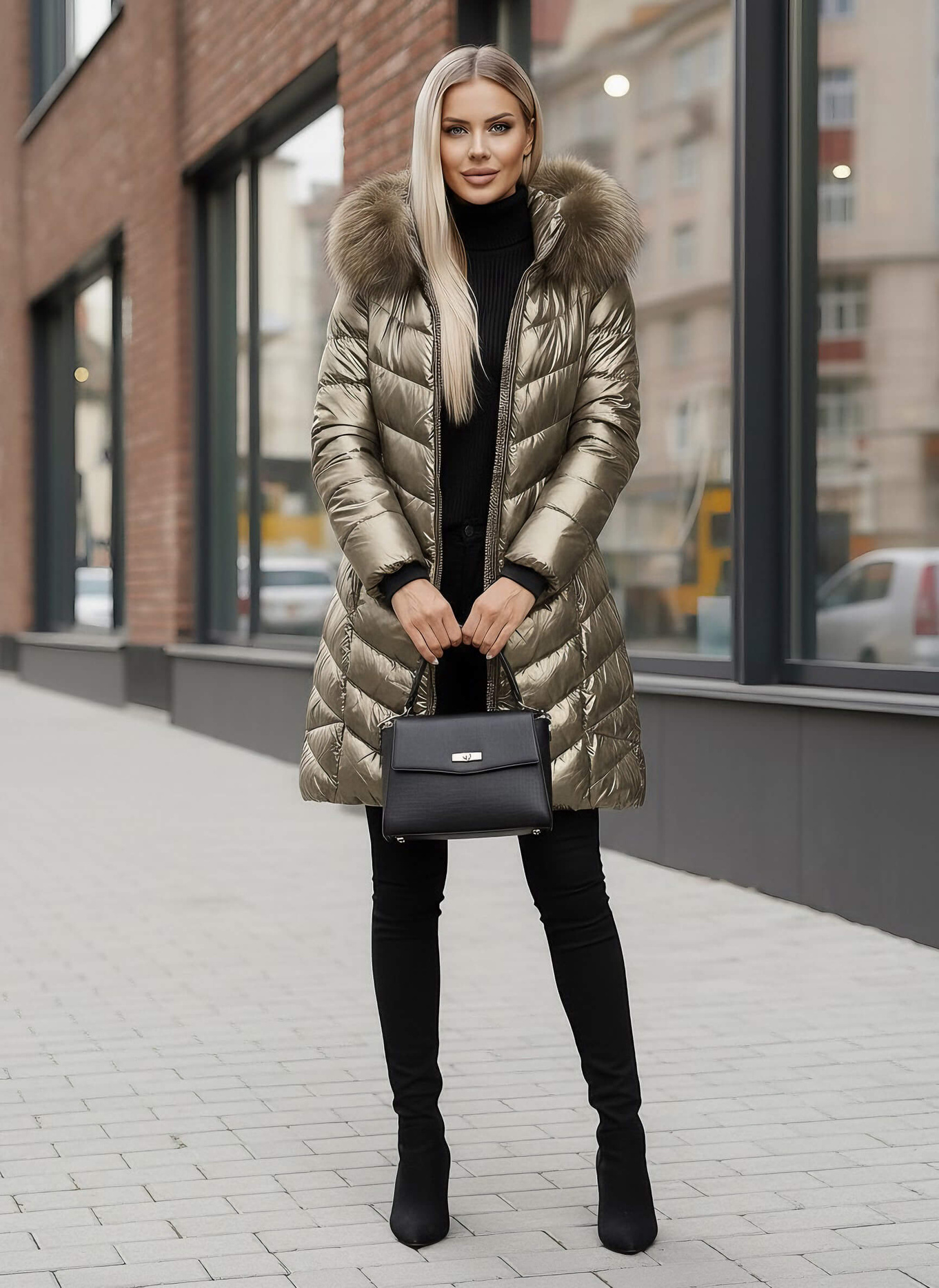 Geacă de iarnă damă OZONEE JS/16M9100 aurie – lungă, cu glugă și blăniță