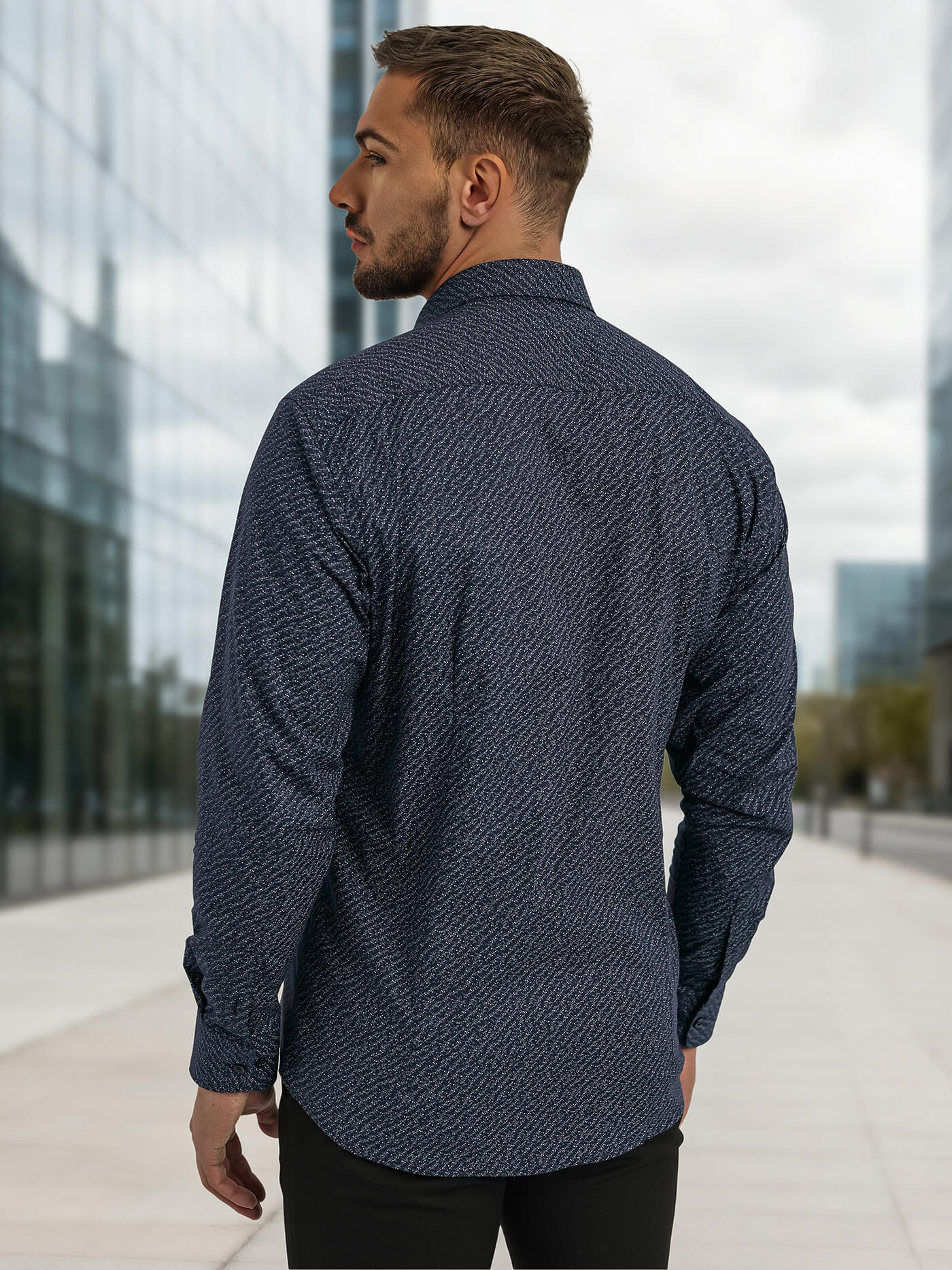 - Cămașă elegantă pentru bărbați, în nuanță bleumarin clasică – versatilă și ușor de asortat