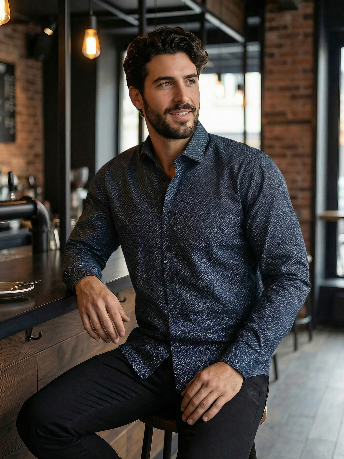 - Cămașă elegantă pentru bărbați, în nuanță bleumarin clasică – versatilă și ușor de asortat
