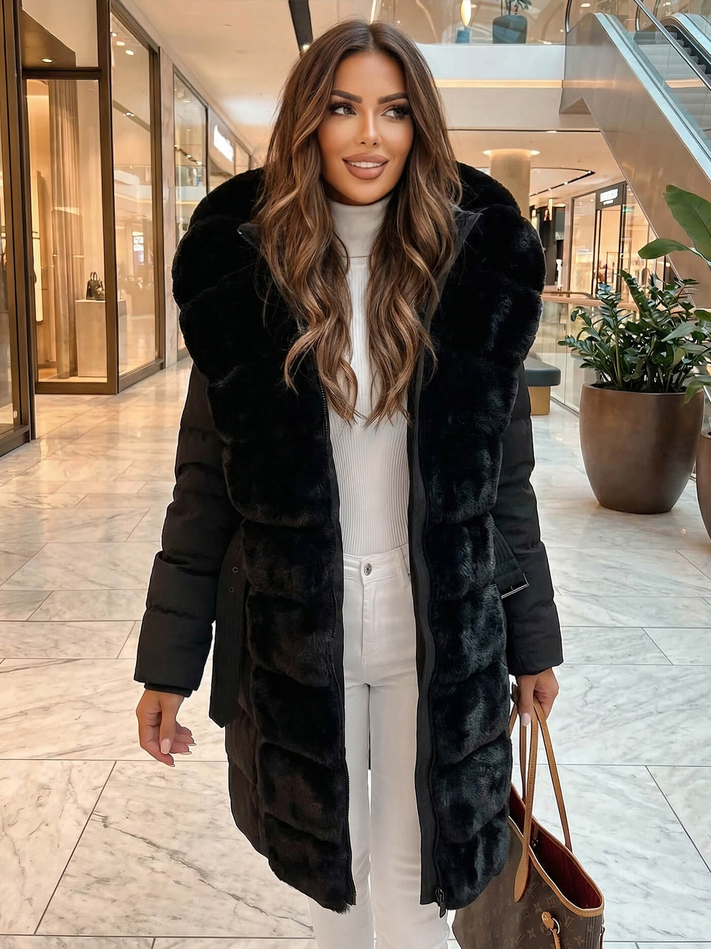 Designul include un glugă generos, blană decorativă detașabilă, cusături în stil matlasat și buzunare laterale cu fermoar. Mânecile sunt prevăzute cu mânșete elastice, asigurând o potrivire perfectă și protecție împotriva frigului.