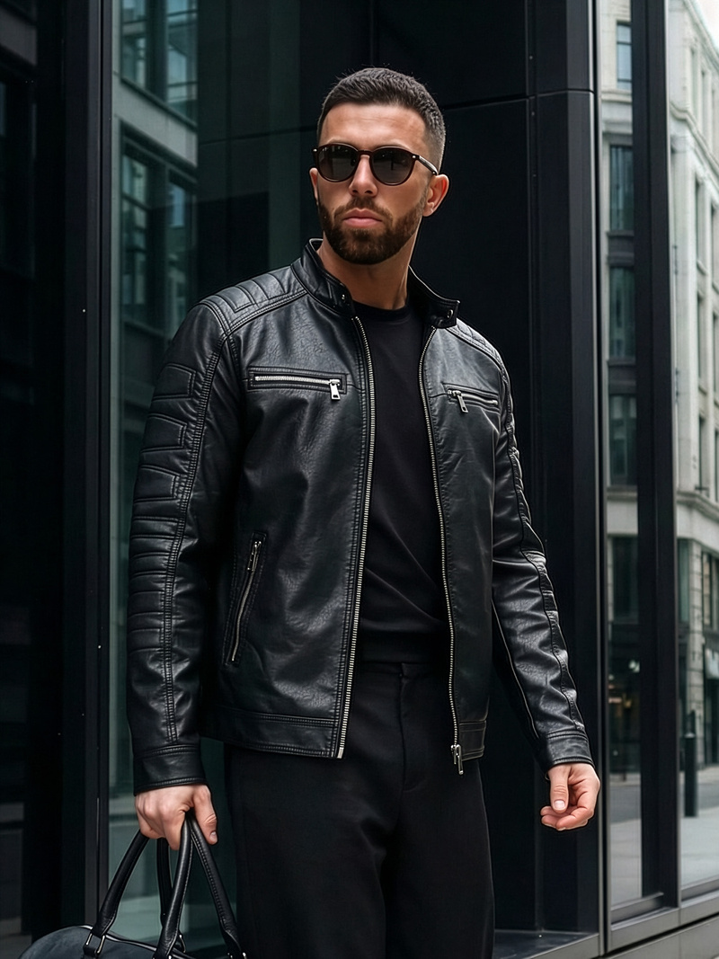 Geacă de piele bărbați neagră OZONEE JS/11Z8138
