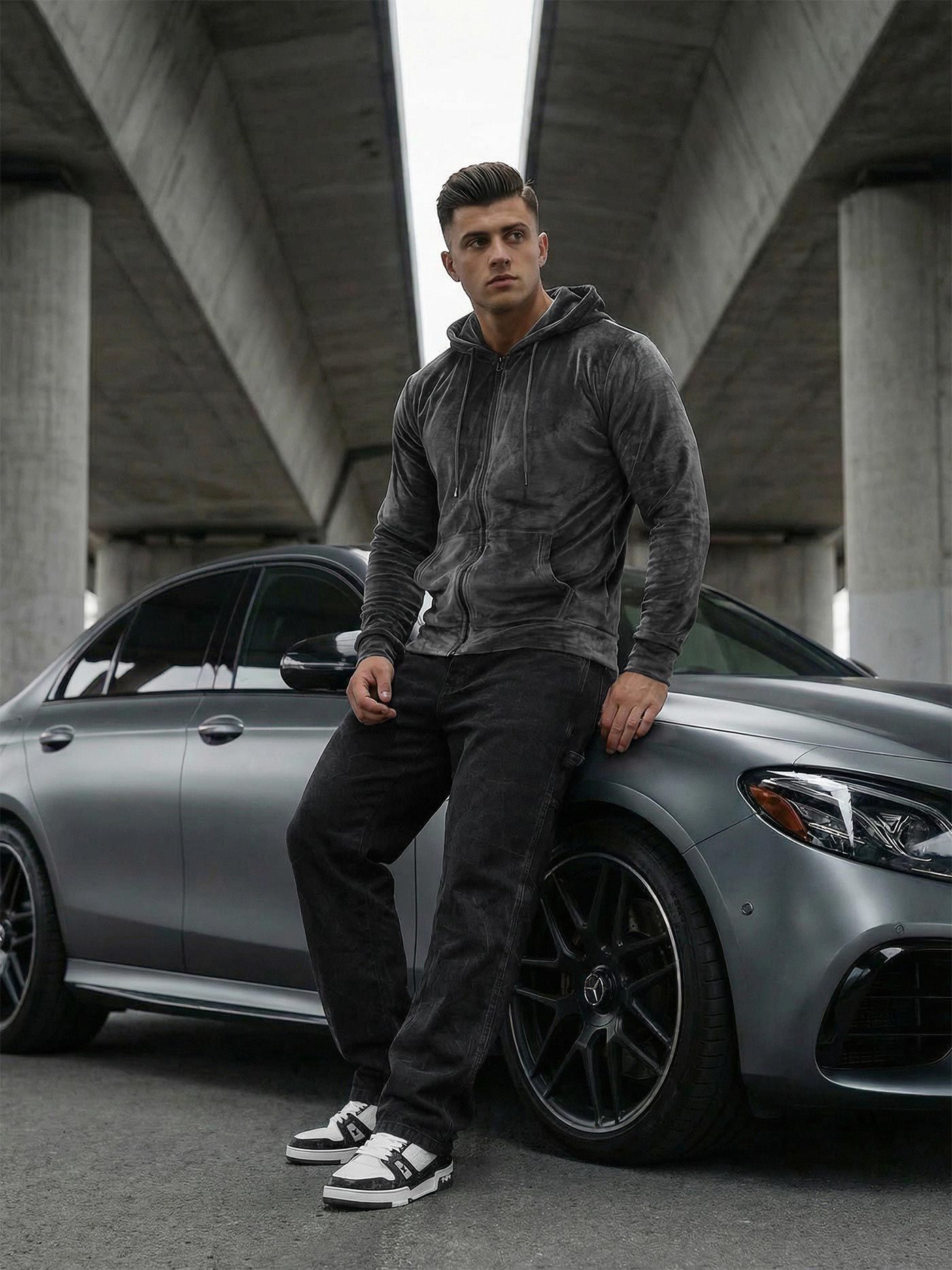 Hanorac cu glugă din catifea grafit pentru bărbați OZONEE JS/8B1168/6Z - stil și confort într-unul singur